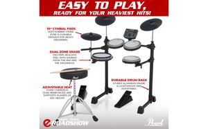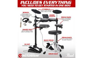 eRoadshow is an all-in-one electronic drum kit from Pearl — a brand trusted by drummers around the world.It includes everything you need to start playing right away. With its compact and quiet design, the kit is perfect for beginners, young players, and families, as well as for drummers who want a second practice kit at home.